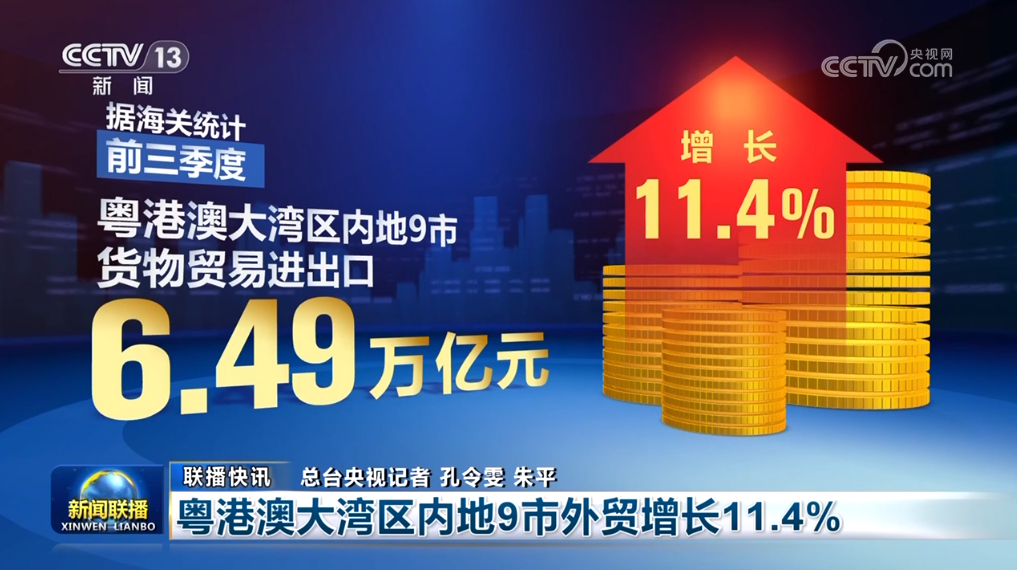 据海关统计,前三季度,粤港澳大湾区内地9市货物贸易进出口6.49万亿元,增长11.4%,占全国的比重达20.1%。其中,传统优势商品出口保持稳定增长,船舶、电动汽车、集装箱等出口新增长点分别增长55.3%、66.6%、135.9%。